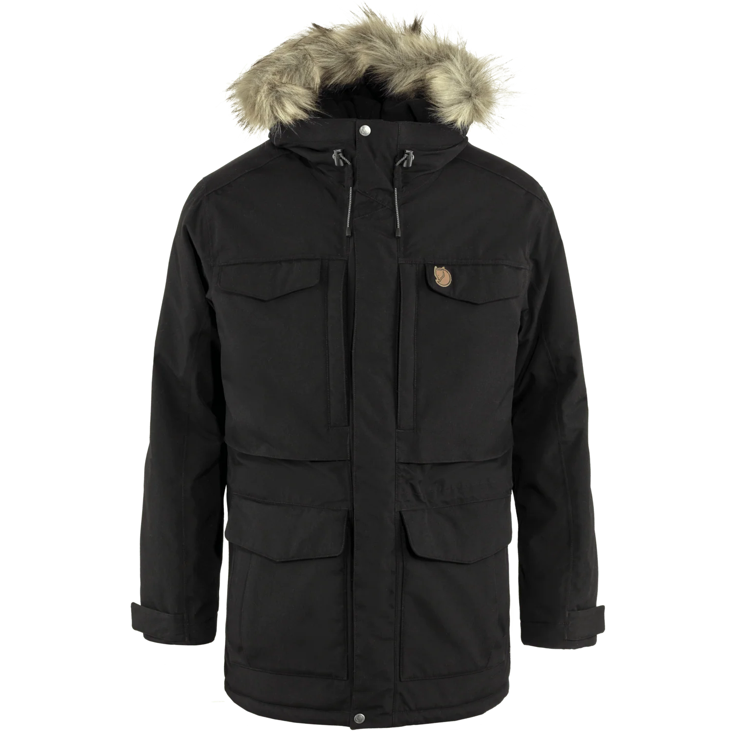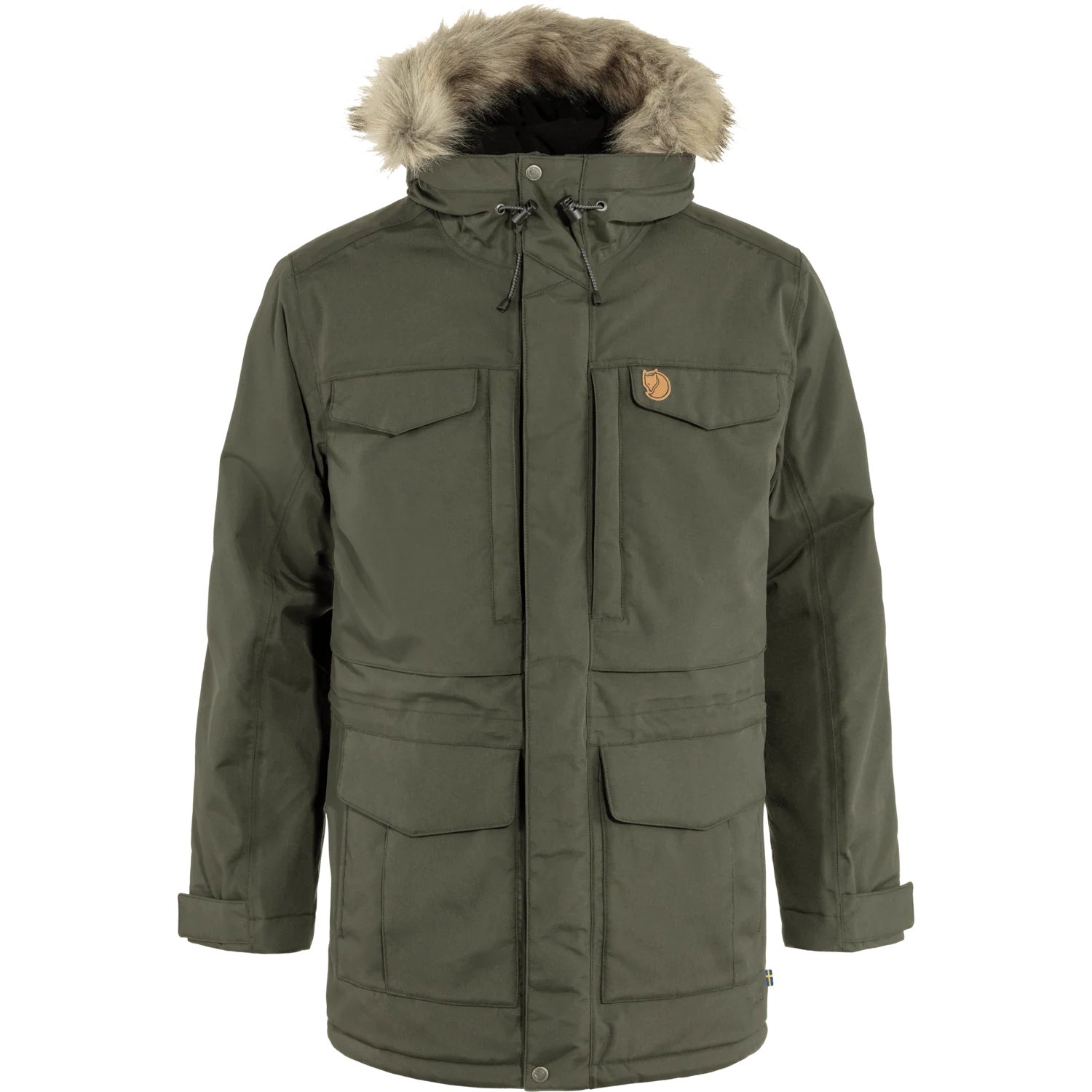 Long, generous parka that reaches down over the rear and thighs. A perfect choice for changeable weather conditions; it protects against the wind and rain, and the synthetic padding will keep you warm in really cold temperatures. Fleece-lined storm hood with metal wire, protective brim and detachable faux fur edging. Eight pockets with plenty of room for essential items. Drawcord at the waist and two-way zipper with protective flap. This is an updated version of Fjällräven’s classic parka, now with sustainable fabrics and improved features and fit.