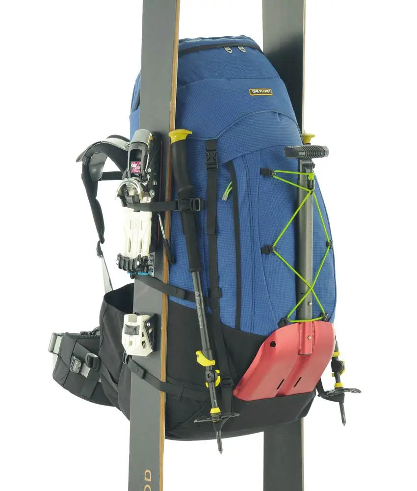 Attachment points: crampons, haul loop, ice axes, keys, mat, poles, shovel, skis, stakes