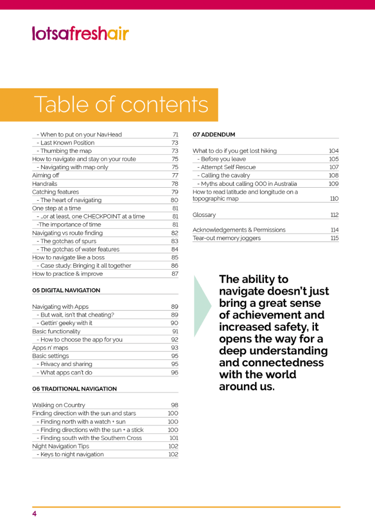 A straight-talking, modern approach to map reading and compass navigation, along with clear explanations of how to really navigate in the Aussie bush through deep awareness and observations of the world around us.