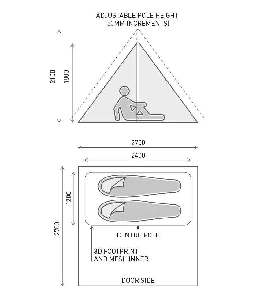 The ‘Mids naturally manage condensation through form and design, steep wall architecture with the telescopic poleand peg points allowing the height to be set for the weather conditions. Inside there’s separate space for sleeping and storage to keep your bedroom tidy and dry, even with wet and muddy gear. The fly doors roll back completely on both sides to create a three-sided ‘Mid with uninterrupted views.