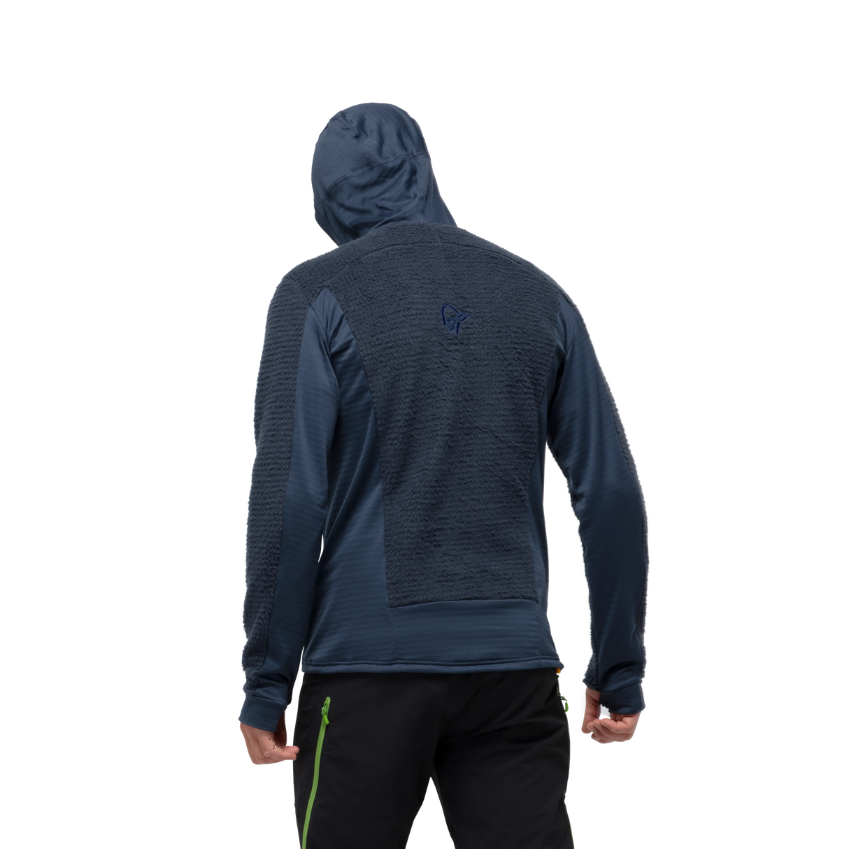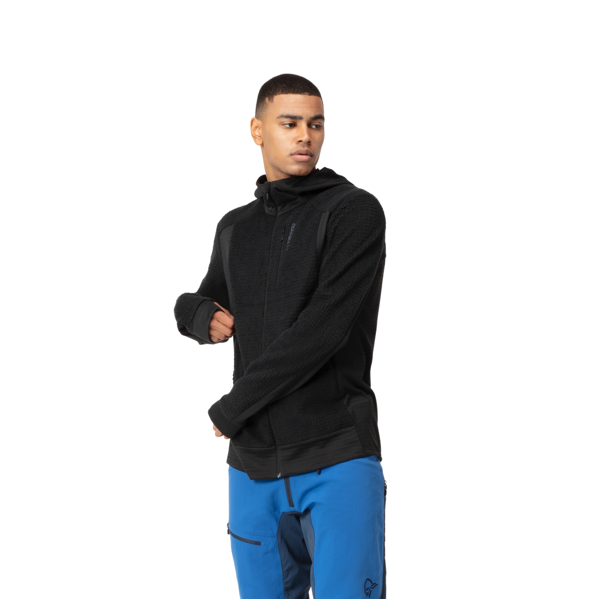 To ensure an optimal range of movement and decrease the fabric mass in strategic places, we have added a more stretchy Polartec® Power Grid 139 g/m2 (97% polyester, 3% elastane) fabric under the arms, down the sides, and hood.