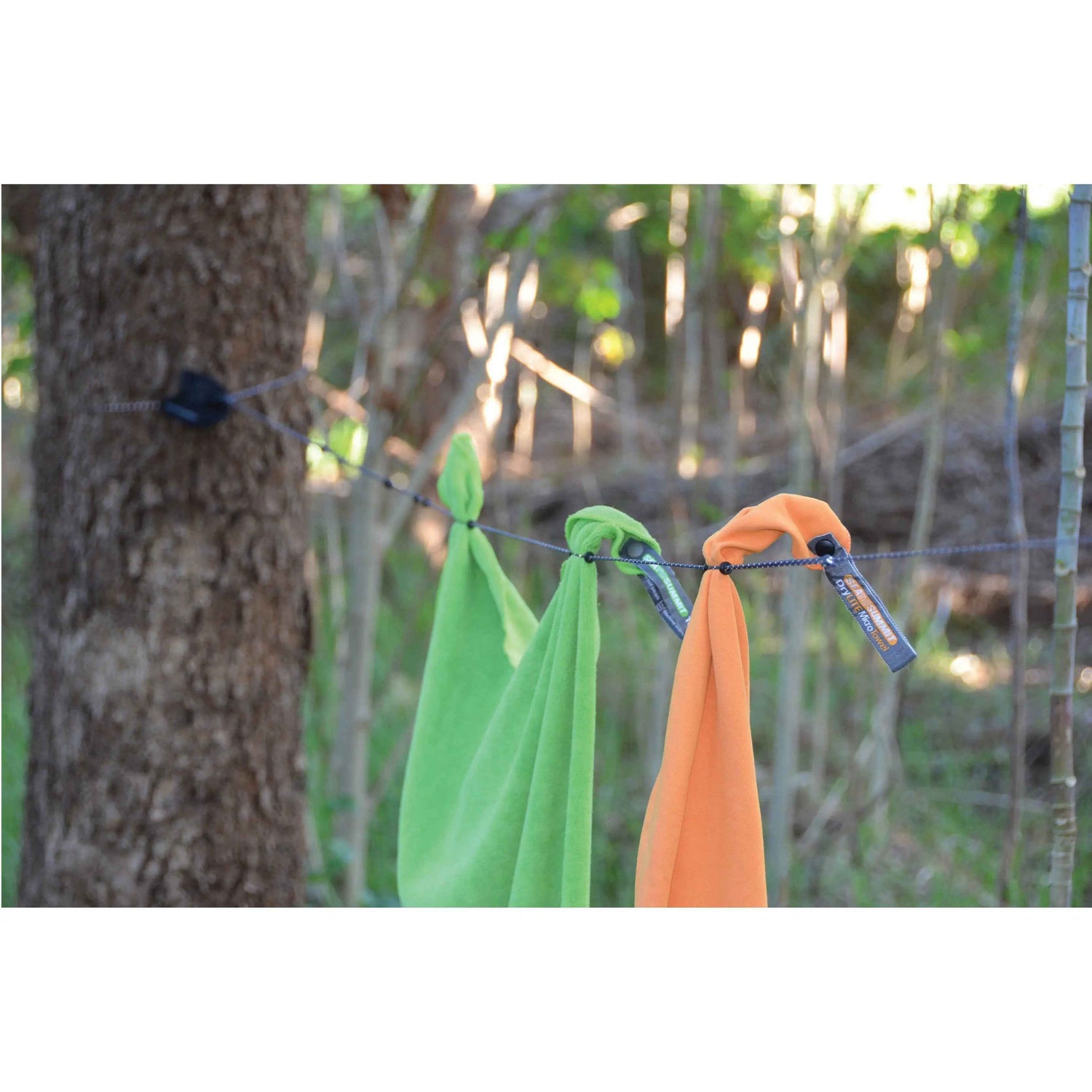 So tiny and compact, this is the perfect portable clothesline that you can take on all of your trips. Our Clothesline uses two parallel cords with rubber 'beads' that can slide along the cords. Hang the clothesline by wrapping each end around a convenient suspension point, then hook it in place. Wet items are then secured between the two cords by sliding the beads together.