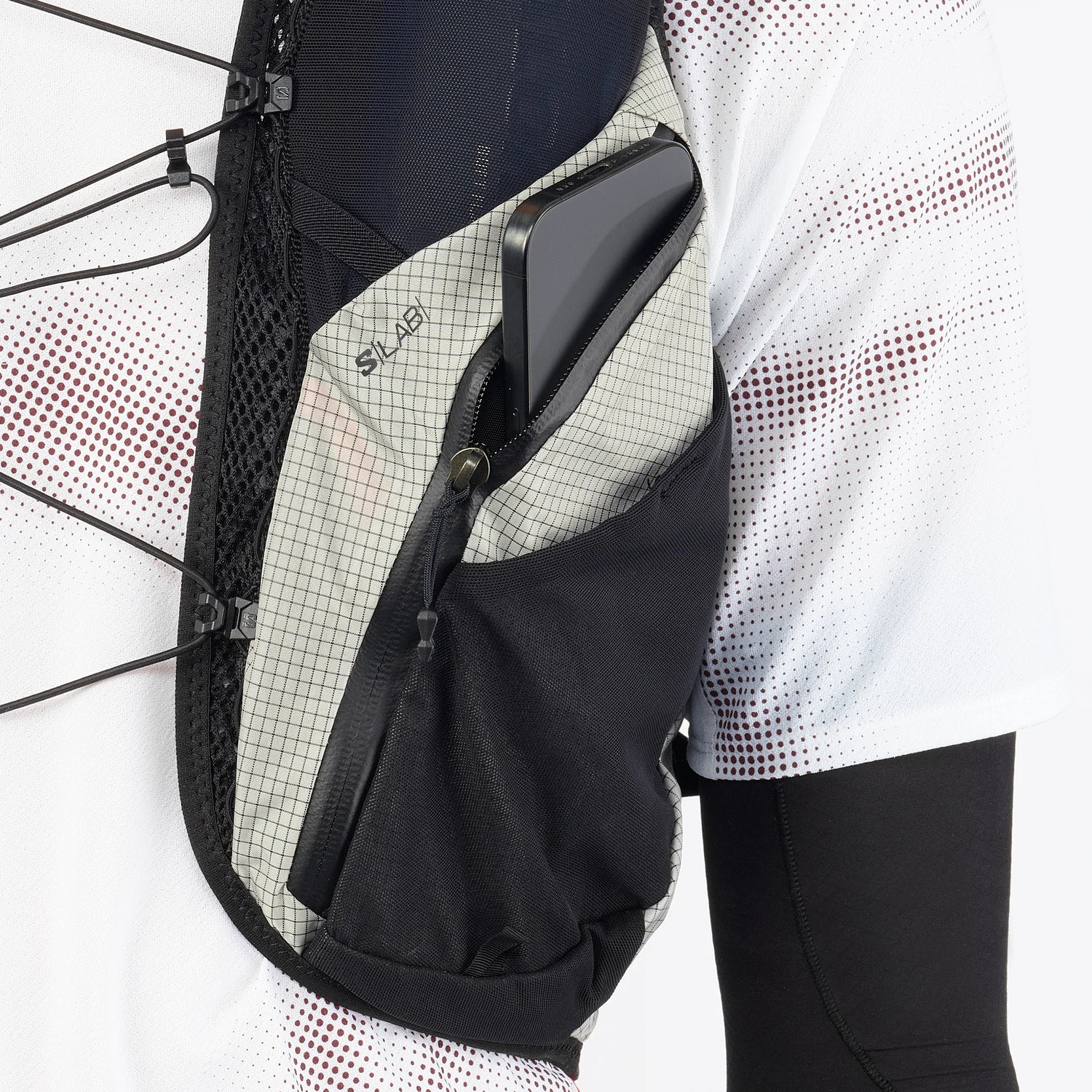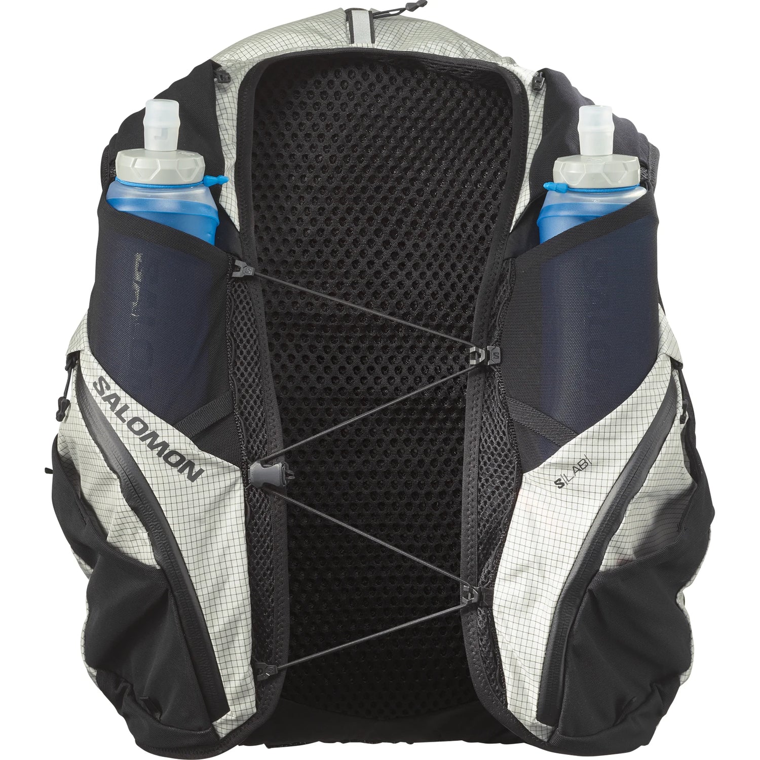 - 2 front flask pockets: Designed to fit Salomon soft flasks, these front pockets limit bouncing. Top elastic loops secure your flasks and keep them ready to drink.